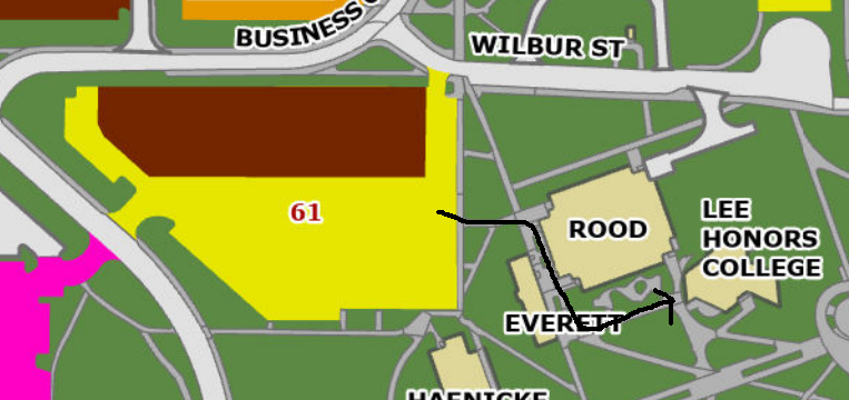 PARKING: There isn't a parking lot right next to the honors college building—the closest lot would be near Rood Hall, which is lot 61. See image below, with an arrow directing you from the parking lot to the Lee Honors College.